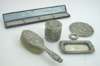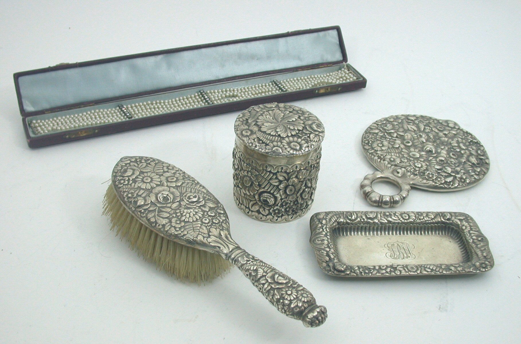 profusely decorated with flowers and foliate scrolls, monogrammed to base and stamped Tiffany & Co., Sterling, a matching rectangular pin dish, also monogrammed and similarly stamped, a circular hand mirror and matching hair brush together with a simulated pearl six-row choker with paste set spacers contained in a fitted case (5)