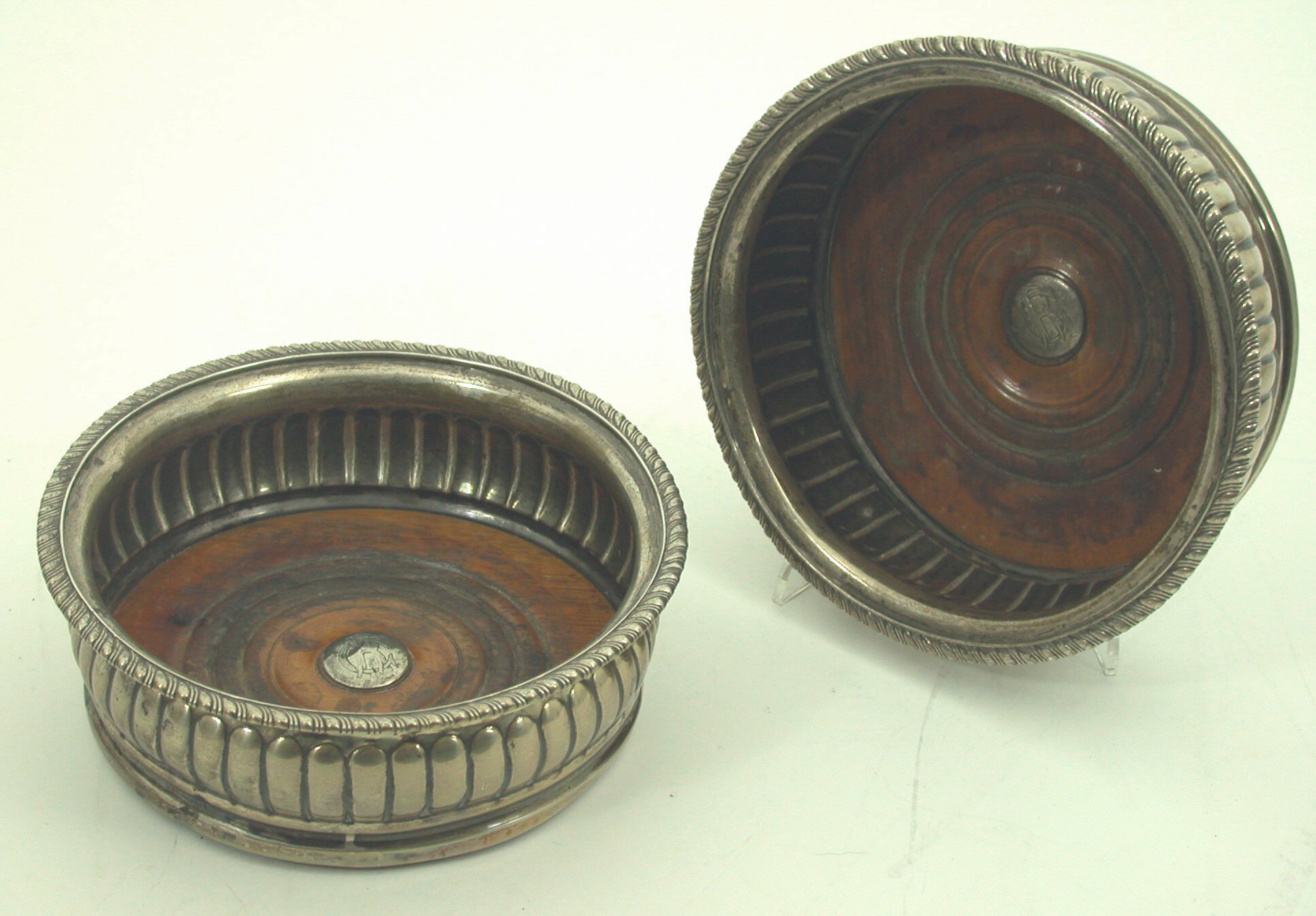 with gadrooned borders, fluted sides and turned wooden bases, monogrammed