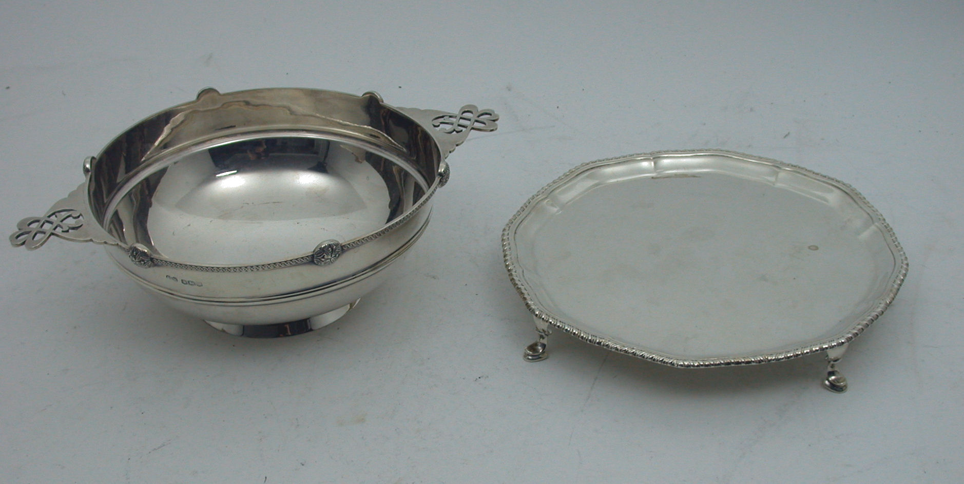 Diameters quaich 26cm and salver 20cm, 25.5oz total