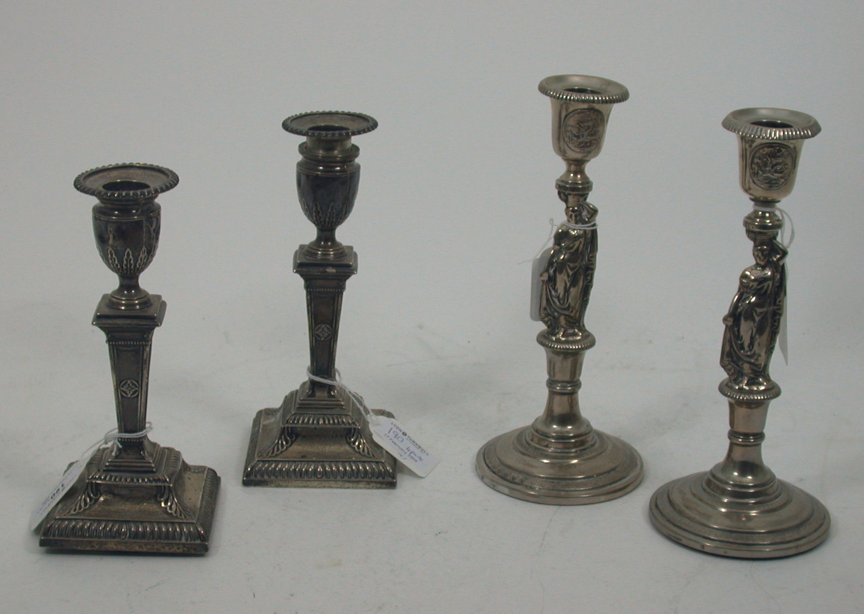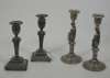 with marks for London 1907, maker Mappin & Webb, of square section with gadroon and stiff leaf borders and vase shaped capitals, together with a pair of white metal figural candlesticks (4)