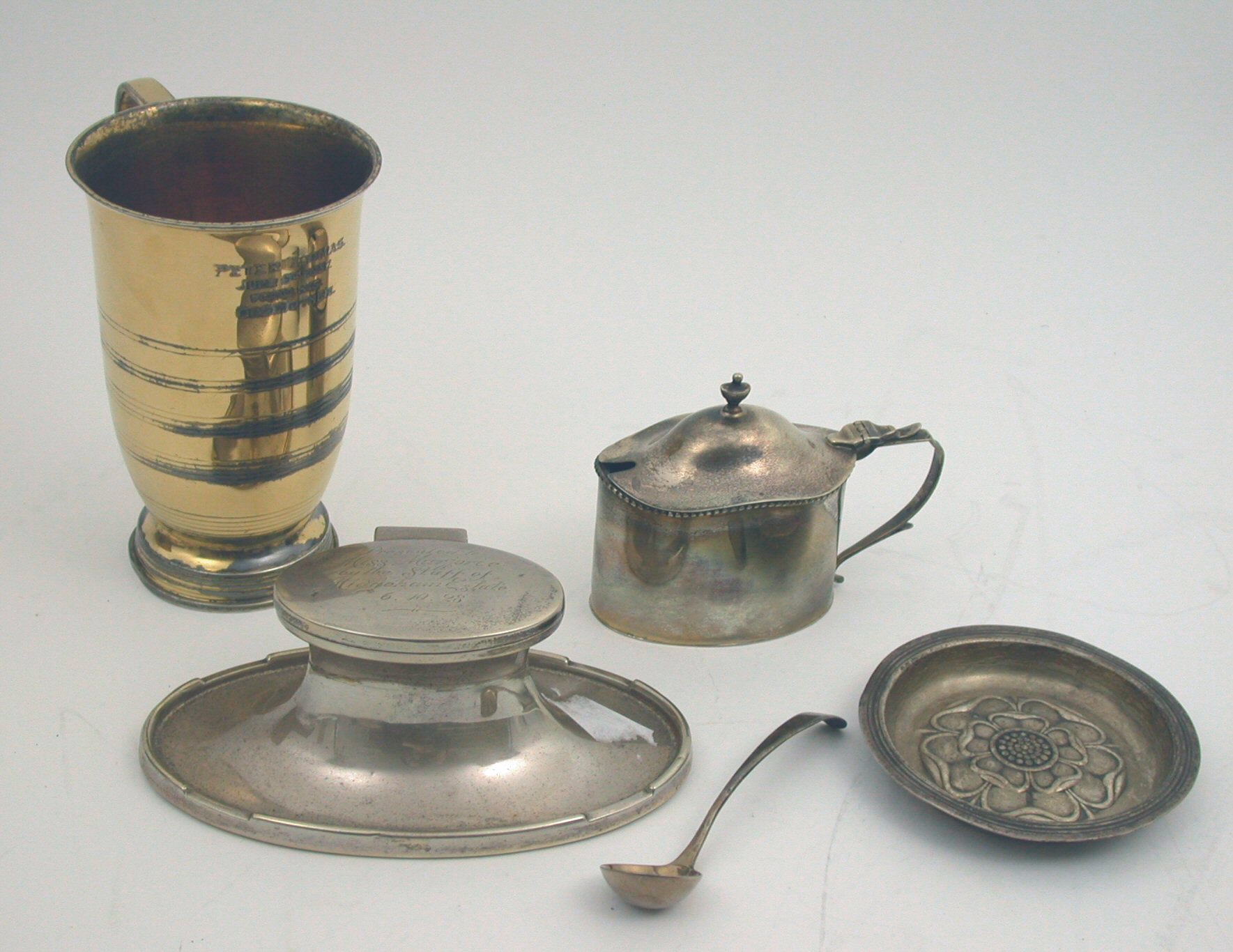 with marks for Birmingham 1927, maker A & J Zimmerman, of oval outline, inscribed to the cover, a gilded christening mug, Birmingham 1936, inscribed, an oval lidded mustard pot, Birmingham 1926, a small circular dish, London 1968, a pale blue guilloche enamel decorated clock and a salt spoon (qty)