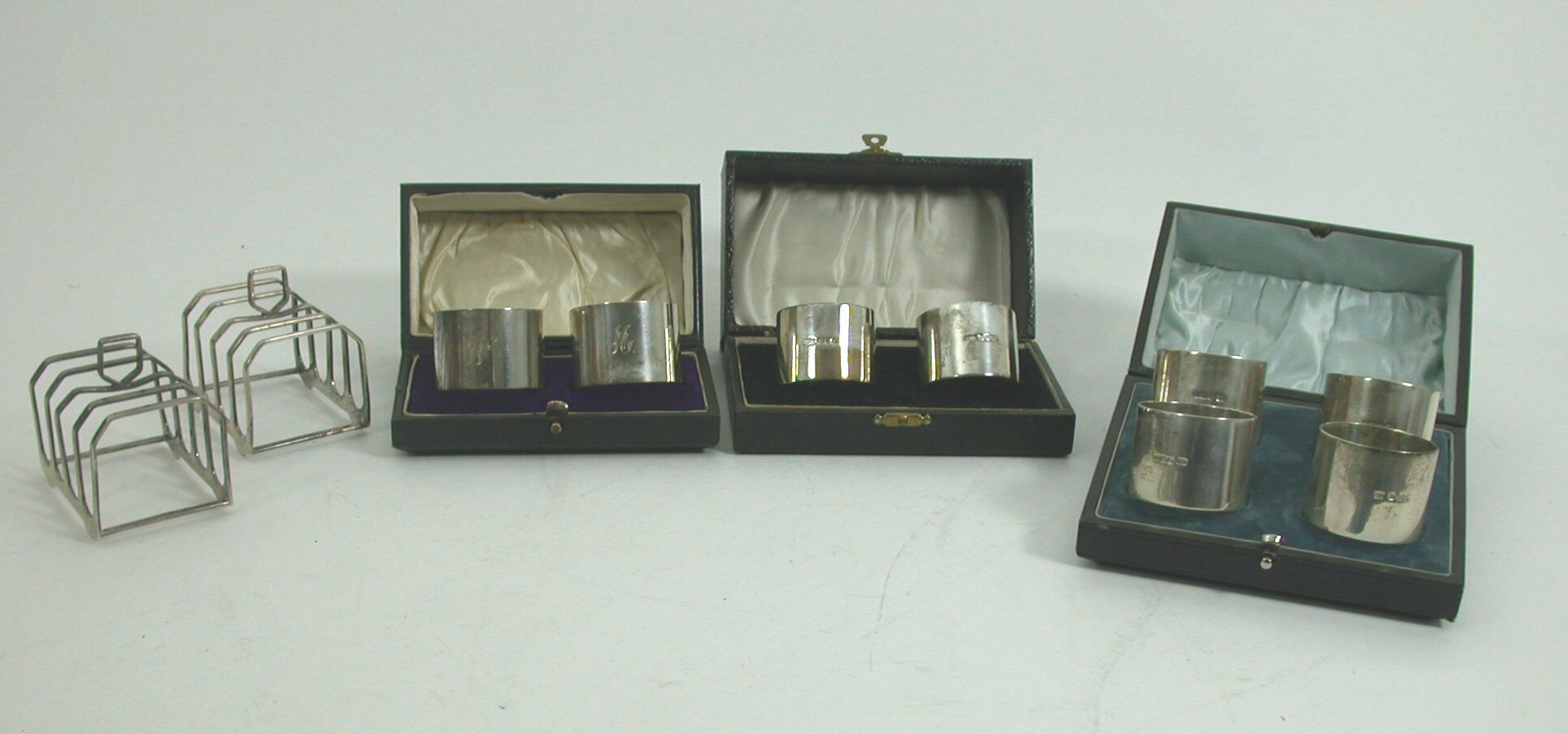 with marks for Birmingham 1947, maker Elkington & Co., of plain form, together with a cased set of four napkin rings, Sheffield 1915, a cased set of two napkin rings, Edinburgh 1945, initialled and another similar set, London 1945 (qty)