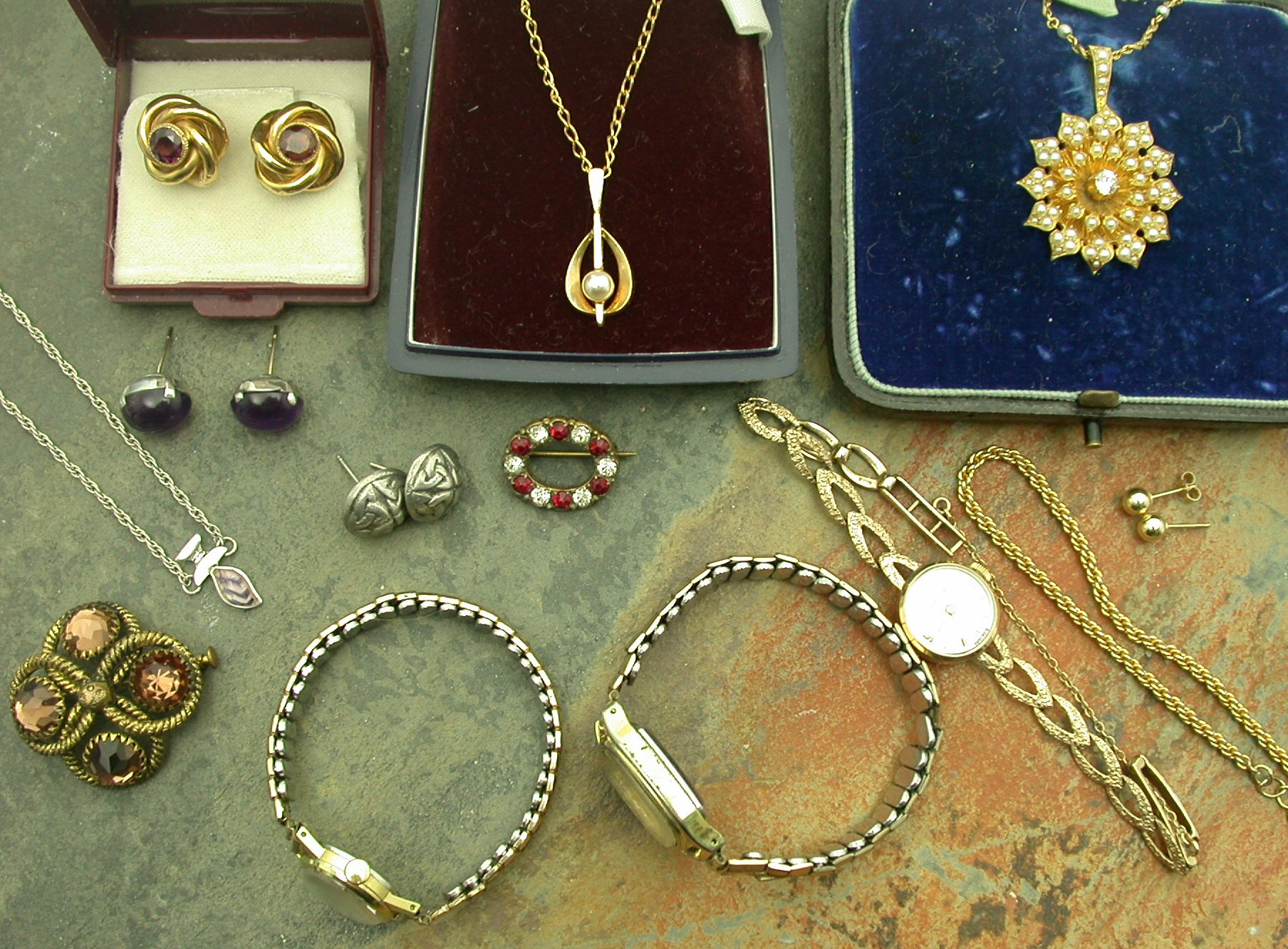 to include an Edwardian flowerhead pendant with central old European cut diamond within a seed pearl set surround suspended from a ropetwist link chain set at intervals with seed pearls, a 9ct gold Favre-Leuba lady's wristwatch, assorted gem set earrings, brooches and other pieces (qty)