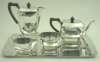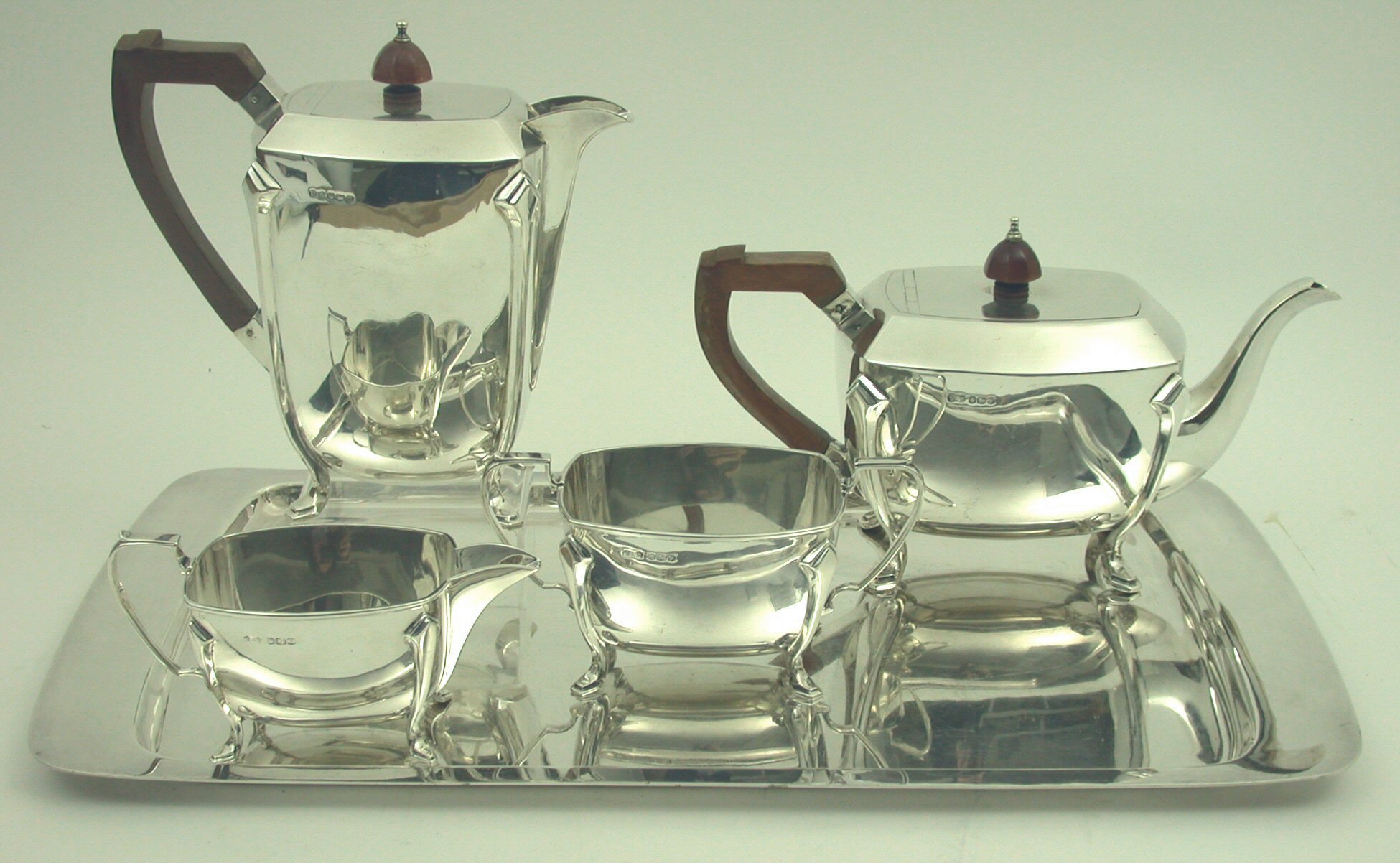 with marks for Sheffield 1937 and 1941, makers S&W and E&S, comprising teapot, hot water pot, twin handled sugar and cream jug, each of oblong outline on four pad feet, together with an electroplated oblong tray by Walker & Hall (5)