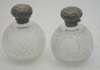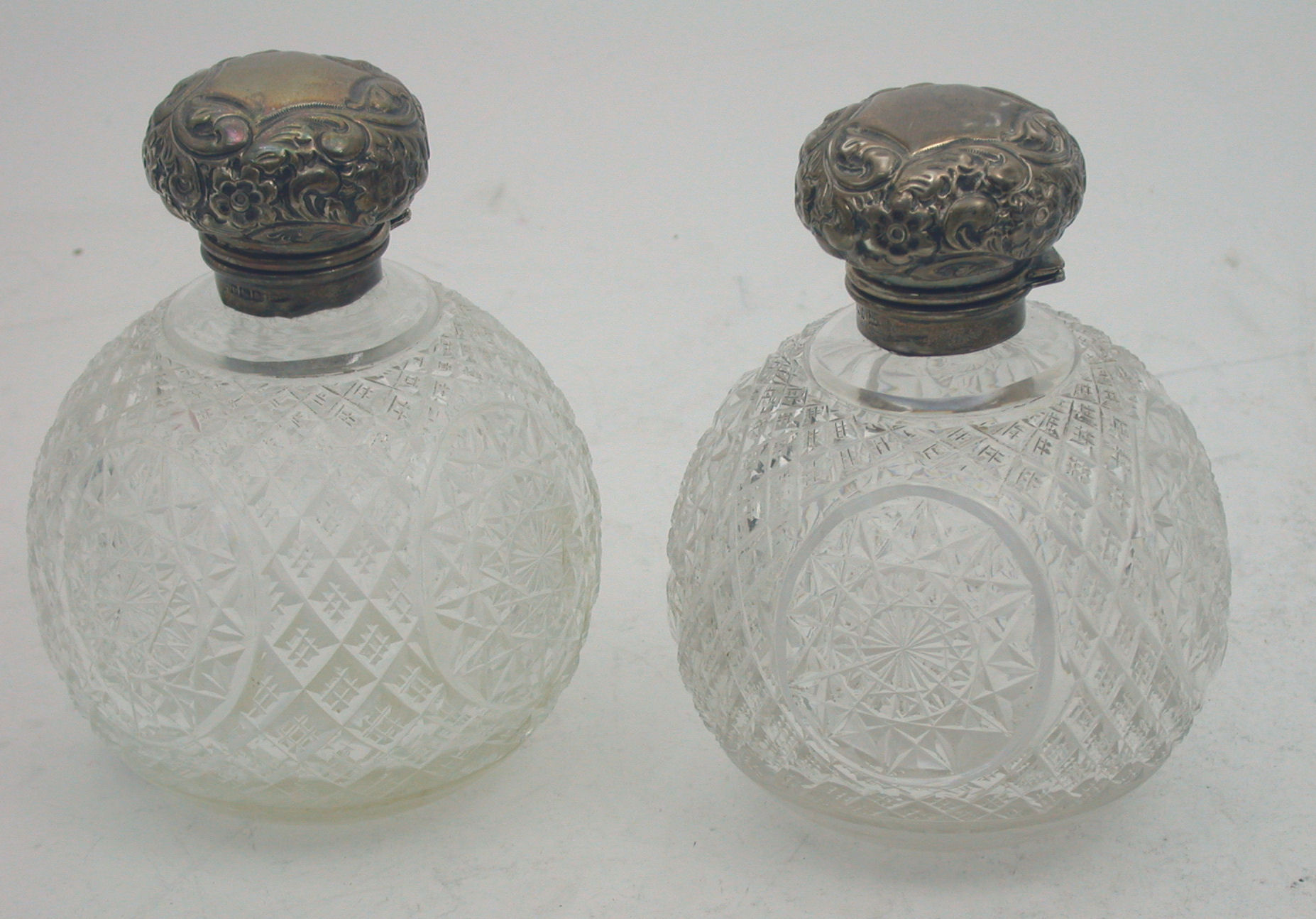 with marks for Sheffield 1906, maker Walker & Hall, each of spherical form with hinged foliate scroll decorated cushion shaped covers and inner glass stoppers