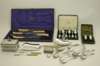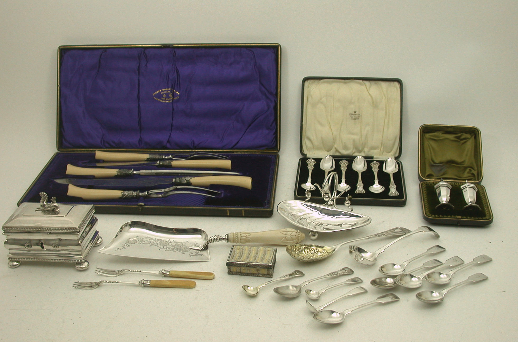 to include an Edwardian cased pair of peppers, with marks for London 1902, of octagonal outline, a cased set of six Queen's pattern teaspoons, with marks for Glasgow 1866, a set of six fiddle pattern teaspoons, London 1862, crested, a continental box with hinged cover and other pieces including an ivory handled crumb tray and electroplated items