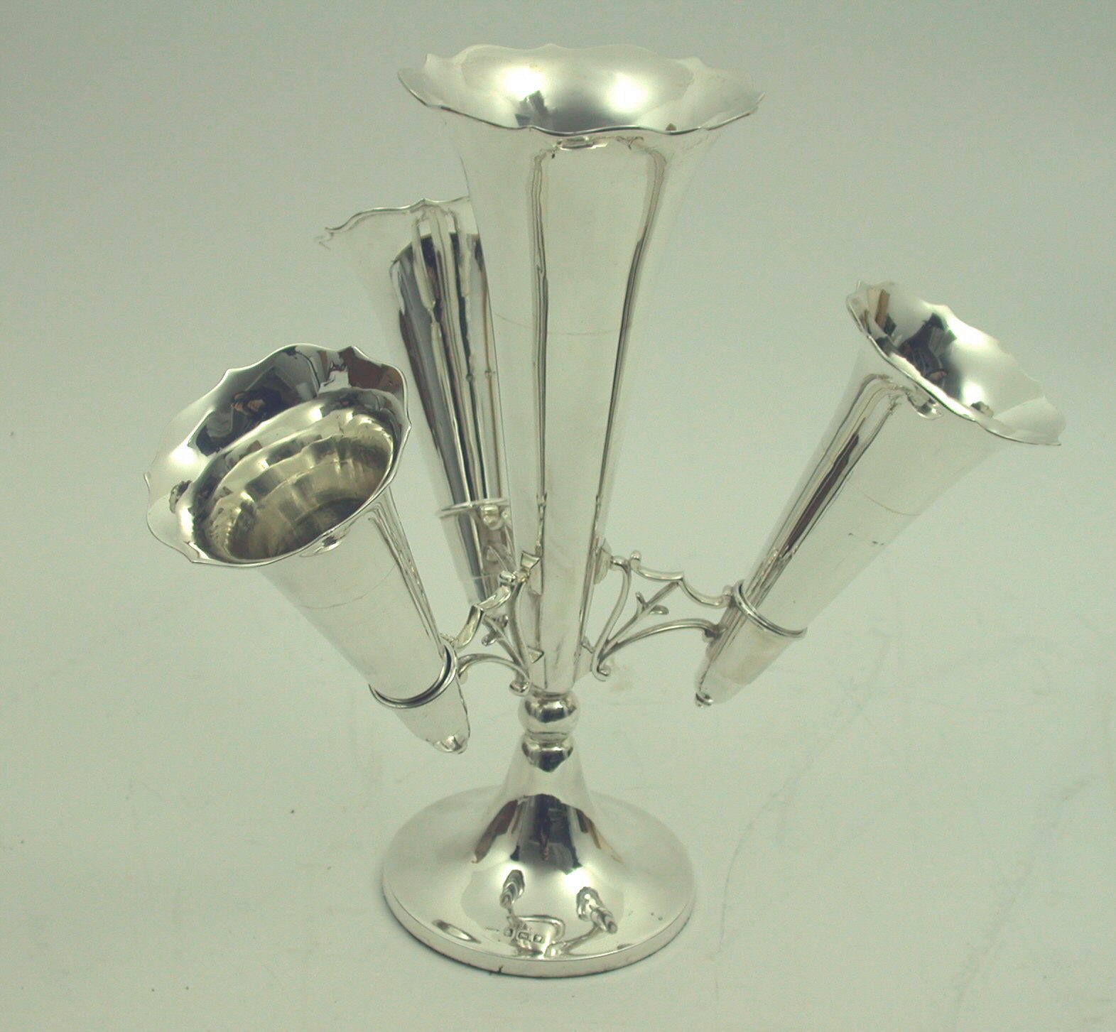 with marks for Birmingham 1922, maker's mark indistinct, the circular base beneath the central trumpet shaped vase with shaped everted rim, flanked by three smaller vases