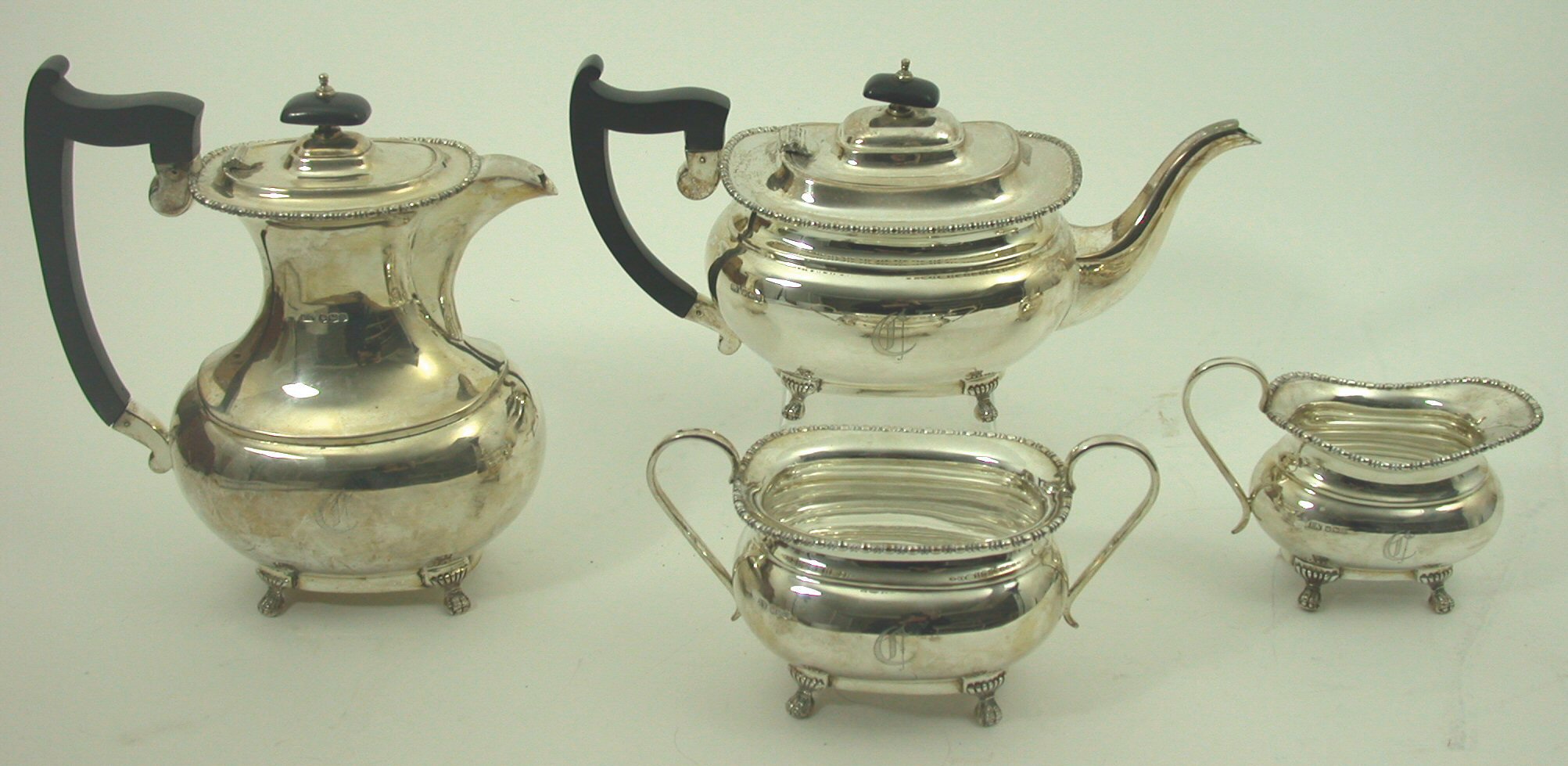 with marks for Sheffield 1929, maker E Viners, comprising teapot, hot water pot, twin handled sugar bowl and milk jug, each of oval outline, with ovolo border on four claw feet, initialled
