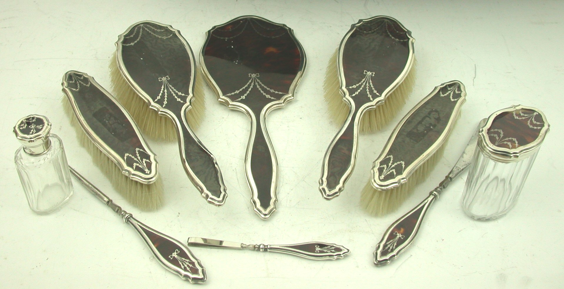 with marks for Birmingham 1926, with husk swag and ribbon decoration, comprising a pair of hair brushes of shaped outline, a clothes brush and a hat brush, a hand mirror, two glass bottles, a shoe horn, a button hook and a pair of tweezers (10)