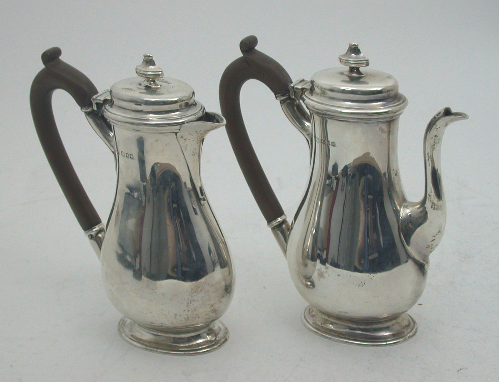 with marks for London 1927, maker Robert Stewart, each of slim oval form on pedestal foot, with flattened vase finials to the hinged domed covers (2)