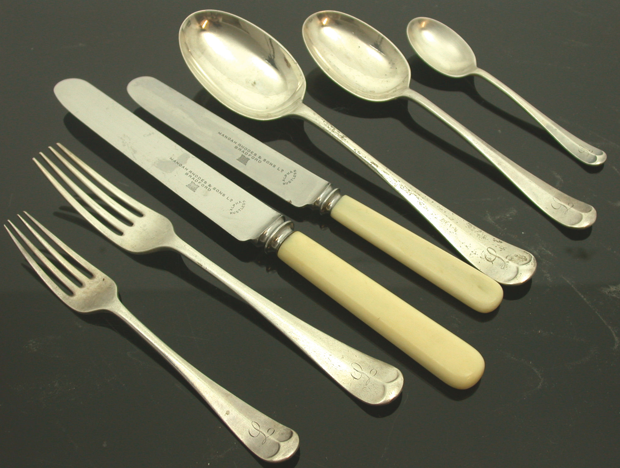 with marks for Sheffield 1928, maker Major Roswell, of Rat Tail pattern, initialled, comprising table forks, dessert forks, table spoons, dessert spoons, teaspoons, ivory handled stainless steel table knives and dessert knives for twelve settings (one teaspoon deficient), with six additional table spoons, a pair of sauce ladles, a soup ladle and a four piece carving set with ivory handles, also a pair of sugar tongs, Sheffield 1897 and an electroplated teaspoon, all contained in an oak chest fitted to the front with two drawers, raised on four cabriole legs on pad feet