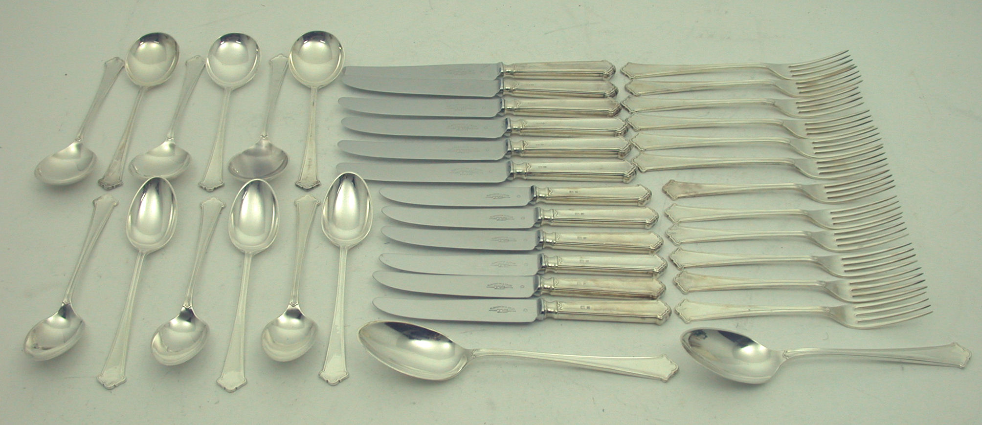 with marks for Birmingham 1961 and 1963, maker Elkington & Co, comprising two table spoons, table forks and knives, dessert forks, knives and spoons and soup spoons for six settings of Chippendale pattern (38)