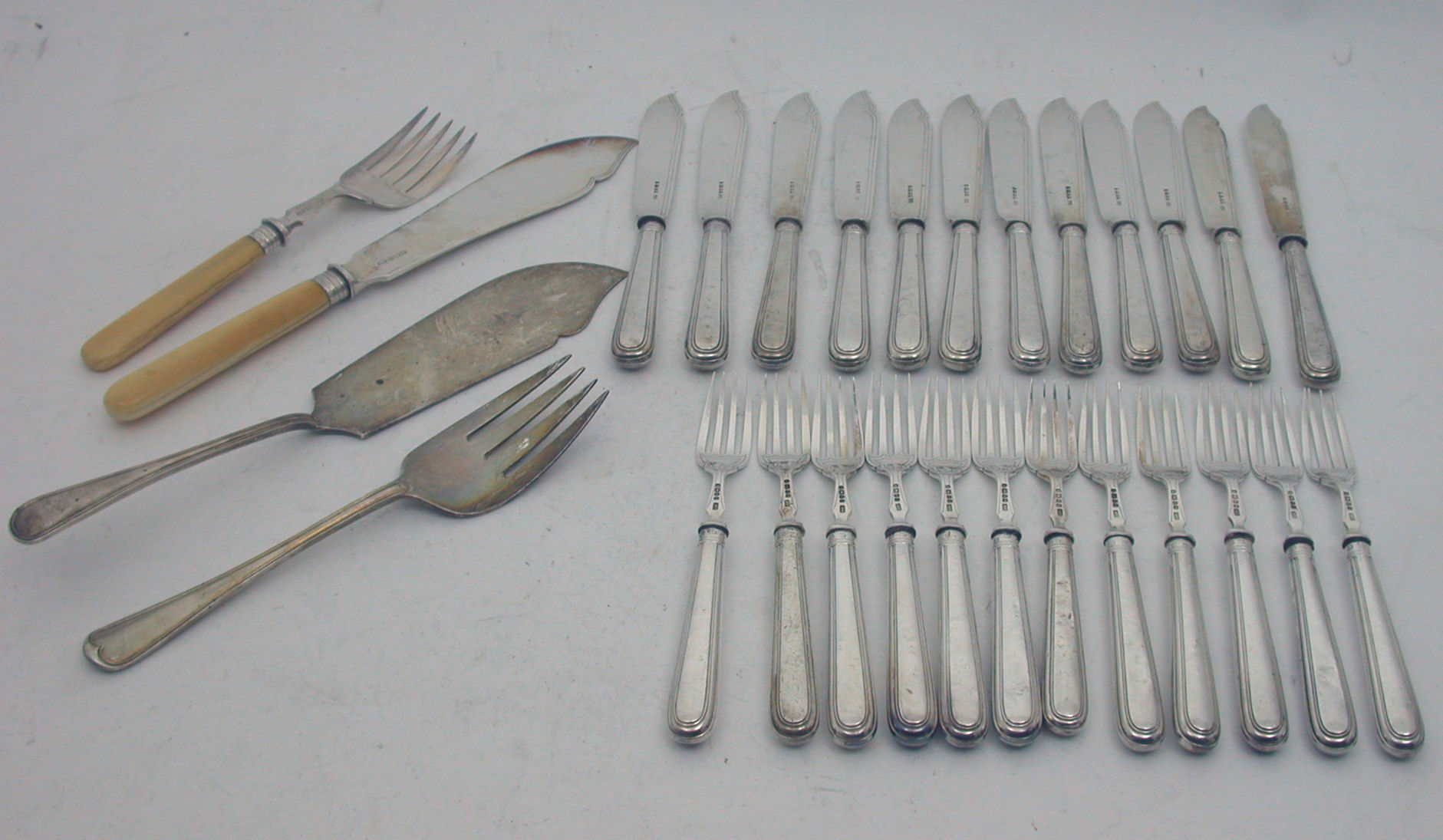 with marks for Sheffield 1875 and 1876, maker HH, together with two pairs of servers, various dates and makers