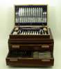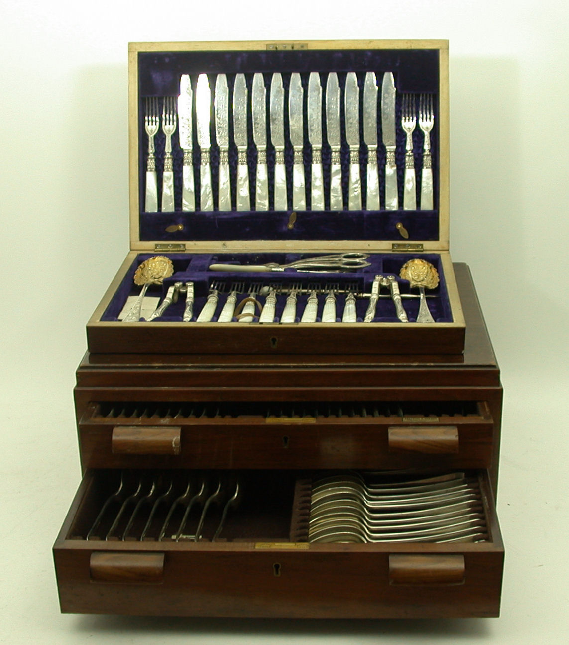 with marks for Sheffield 1938 and 1939, maker Mappin & Webb, of Old English pattern, comprising ten table forks, twelve dessert forks, nine tablespoons, eleven dessert spoons, eight soup spoons, nine teaspoons and two sauce ladles contained in a fitted mahogany case, together with two assorted butter knives and a cased electroplated dessert service