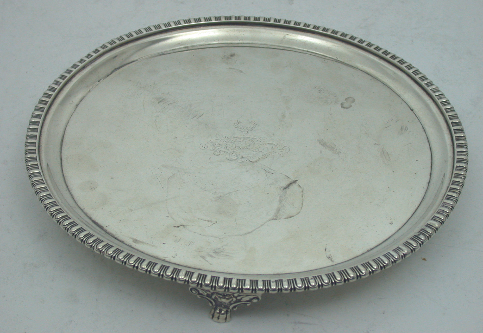 with marks for Edinburgh 1817, maker M&R, of circular form with ovolo border, on three scroll feet, crested