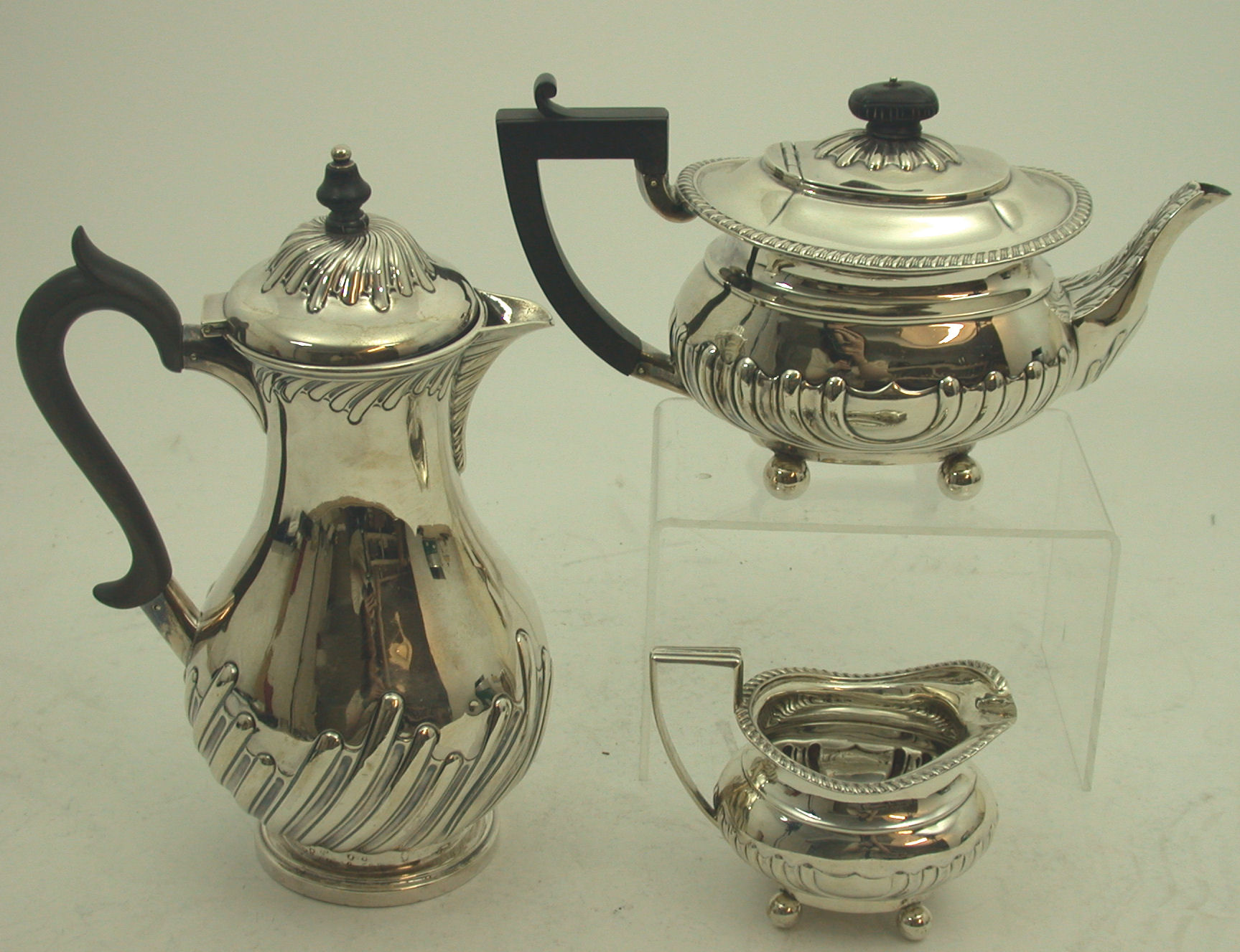 with marks for Edinburgh 1899, maker Hamilton & Inches, each of oval semi-fluted form with gadrooned border on four ball feet, the teapot with leaf cast spout, together with a hot water pot, Edinburgh 1900, by Hamilton & Inches, of semi-spiral fluted baluster form, on circular foot, with wooden finial to the domed hinged cover (3)