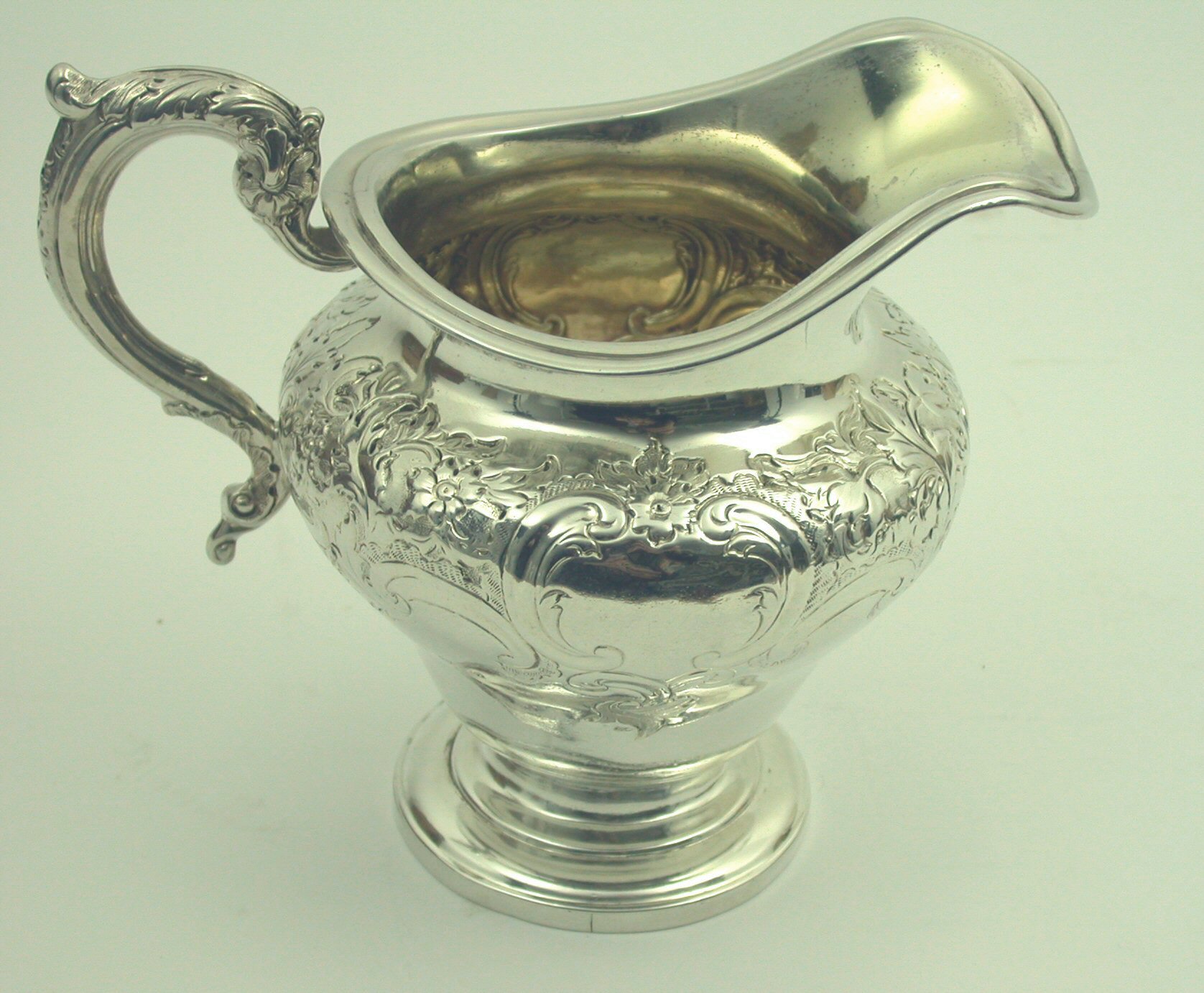 with marks for Edinburgh 1838, maker W Cunningham?, of inverted baluster form, decorated with a border of C-scrolls, foliage and vacant cartouches, with leaf capped scroll handle on pedestal foot