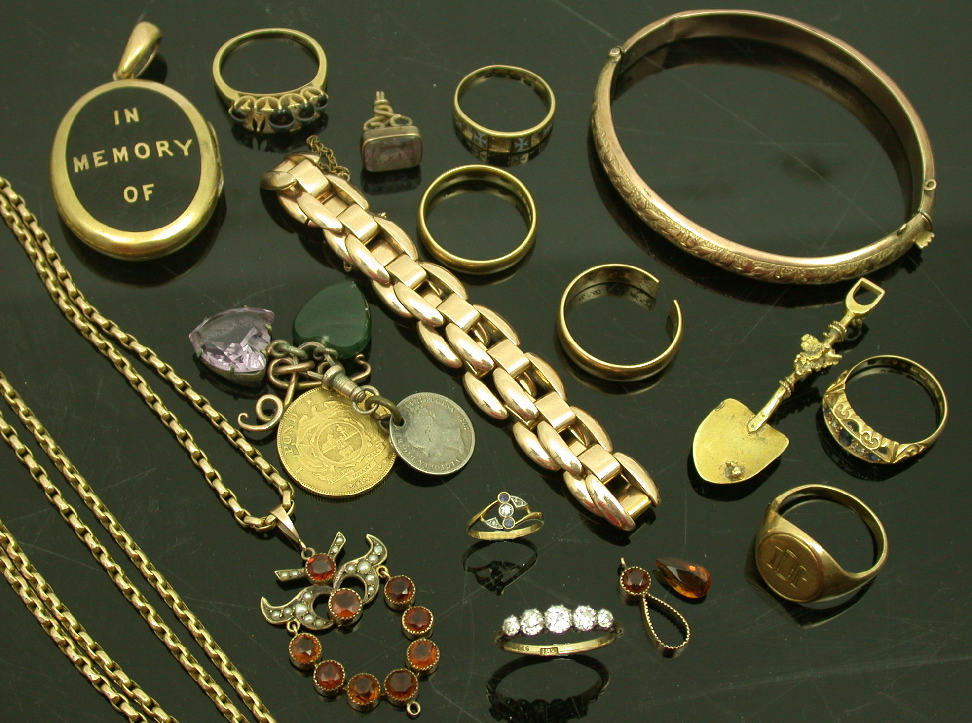 to include an 18ct gold mounted diamond five stone ring (s.d.), an 18ct gold sapphire and diamond five stone ring, a child's gem set ring, a signet ring, a 9ct gold citrine and seed pearl pendant (s.d.), a 15ct gold belcher link long chain, a 15ct gold bracelet, a 9ct gold hinged bangle and other pieces (qty)