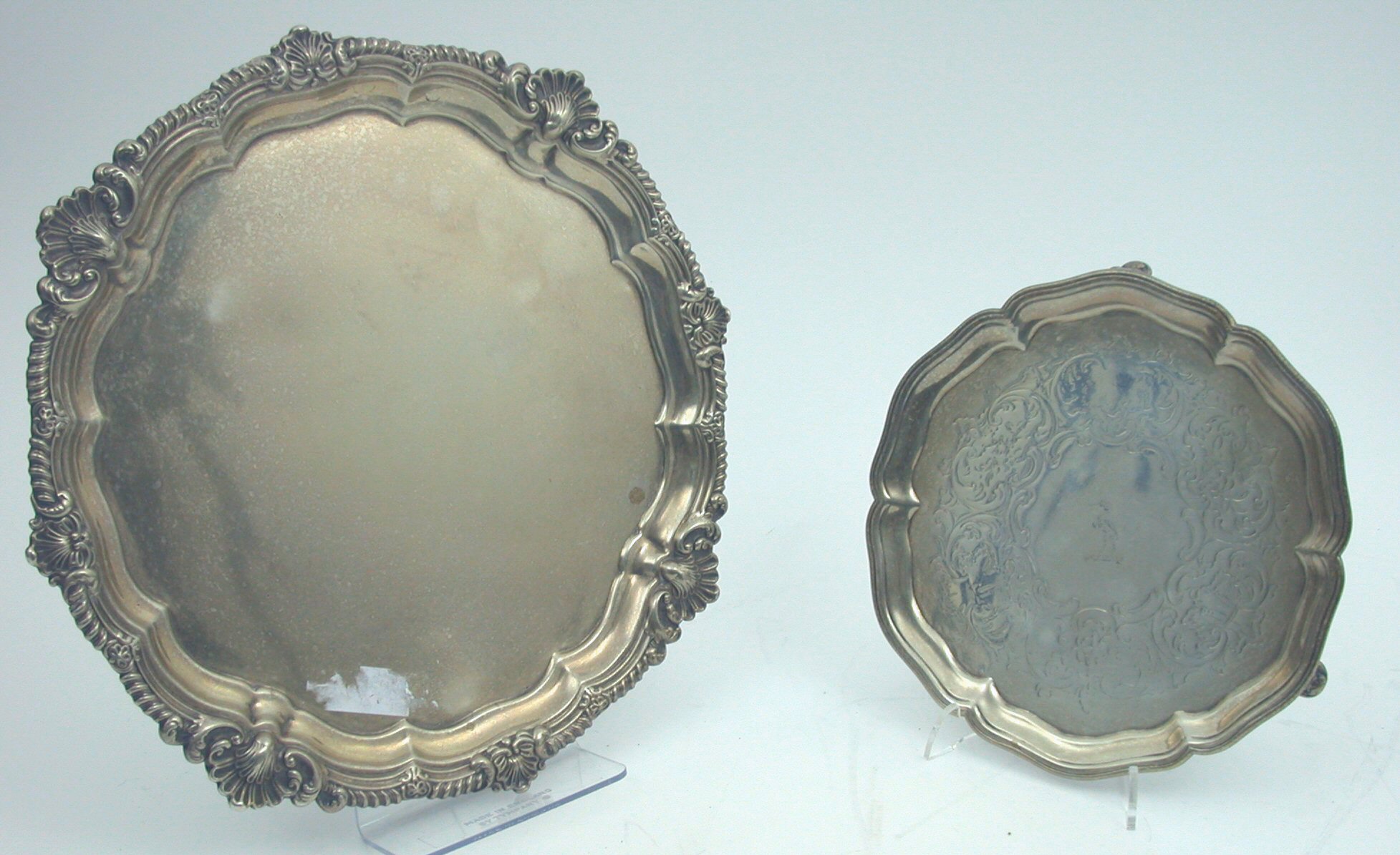 with marks for London 1852, of shaped circular form, with foliate engraved border, on three scroll feet, crested, diameter 18.5cm, together with a salver, London 1918, with gadroon and shell cast border, on four scroll feet, diameter 27.5cm (2)