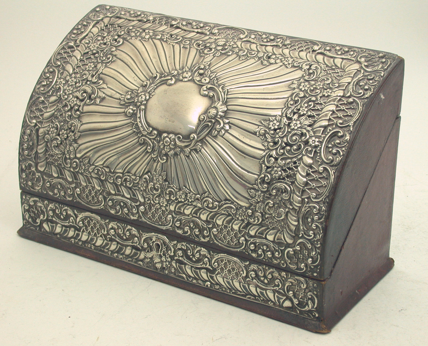 with marks for Birmingham 1901, maker HM, of rectangular outline with domed hinged cover, the front with C-scroll, foliate and diaper pierced mount with central vacant cartouche, with fitted interior