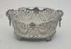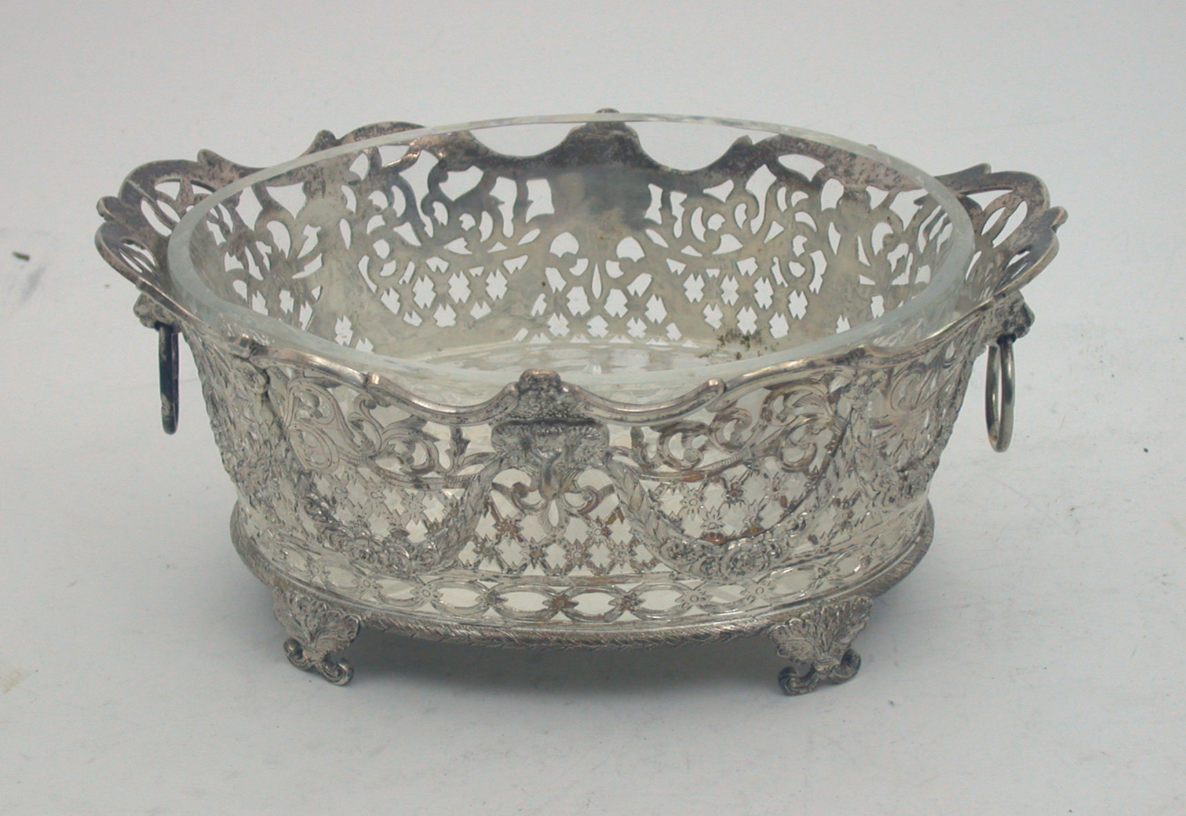 with marks for London 1895, maker GL, with shaped everted rim and pierced sides cast with floral swags and ram's masks, flanked by ring handles, on four scroll feet, with clear glass liner, width 22cm, together with a circular sugar bowl, London 1906, maker Goldsmiths & Silversmiths Co. Ltd, with foliate cast decoration, diameter 10.5cm (2)