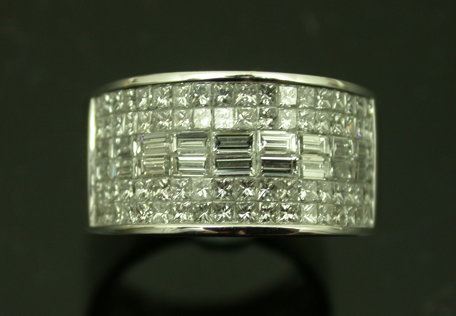 invisibly set to the front with rows of princess and baguette cut diamonds, the mount stamped K18, 750