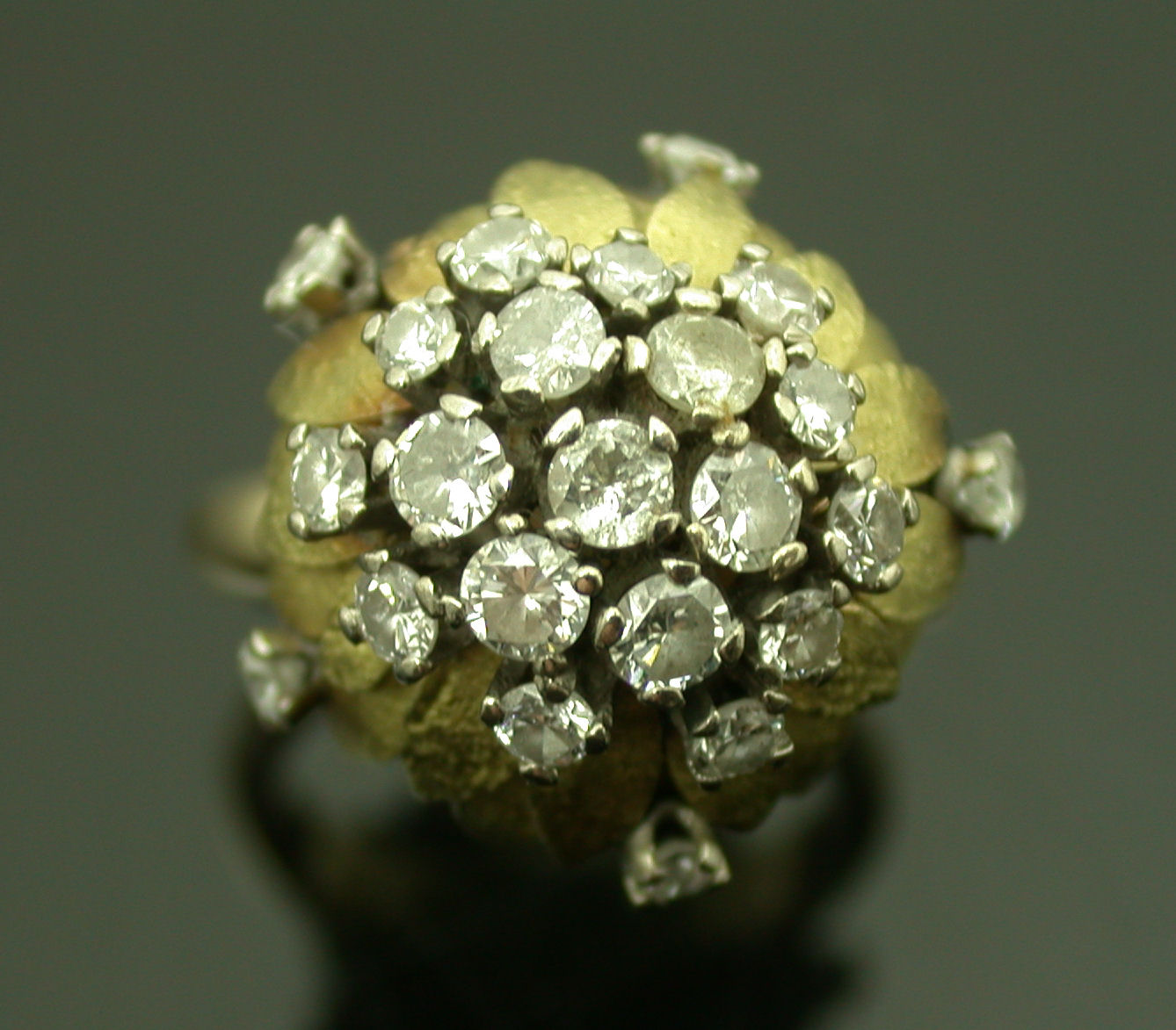 claw set with slightly graduated brilliant cut diamonds to a domed foliate cast surround