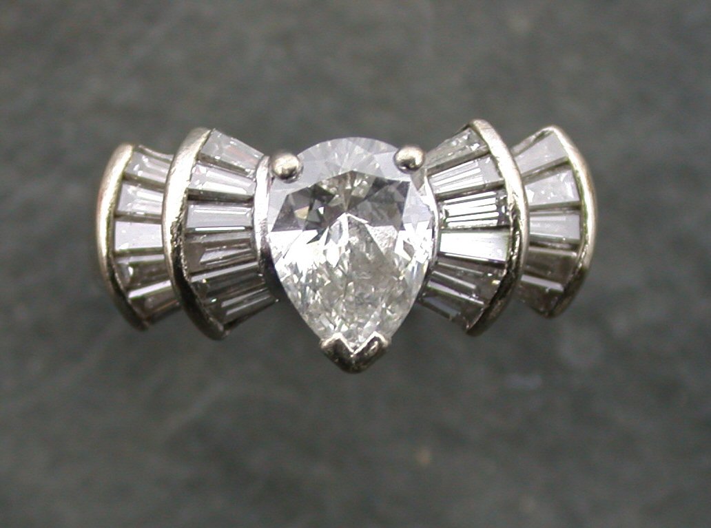 the central claw set pear cut diamond, flanked to either side by two rows of channel set tapered baguette cut diamonds