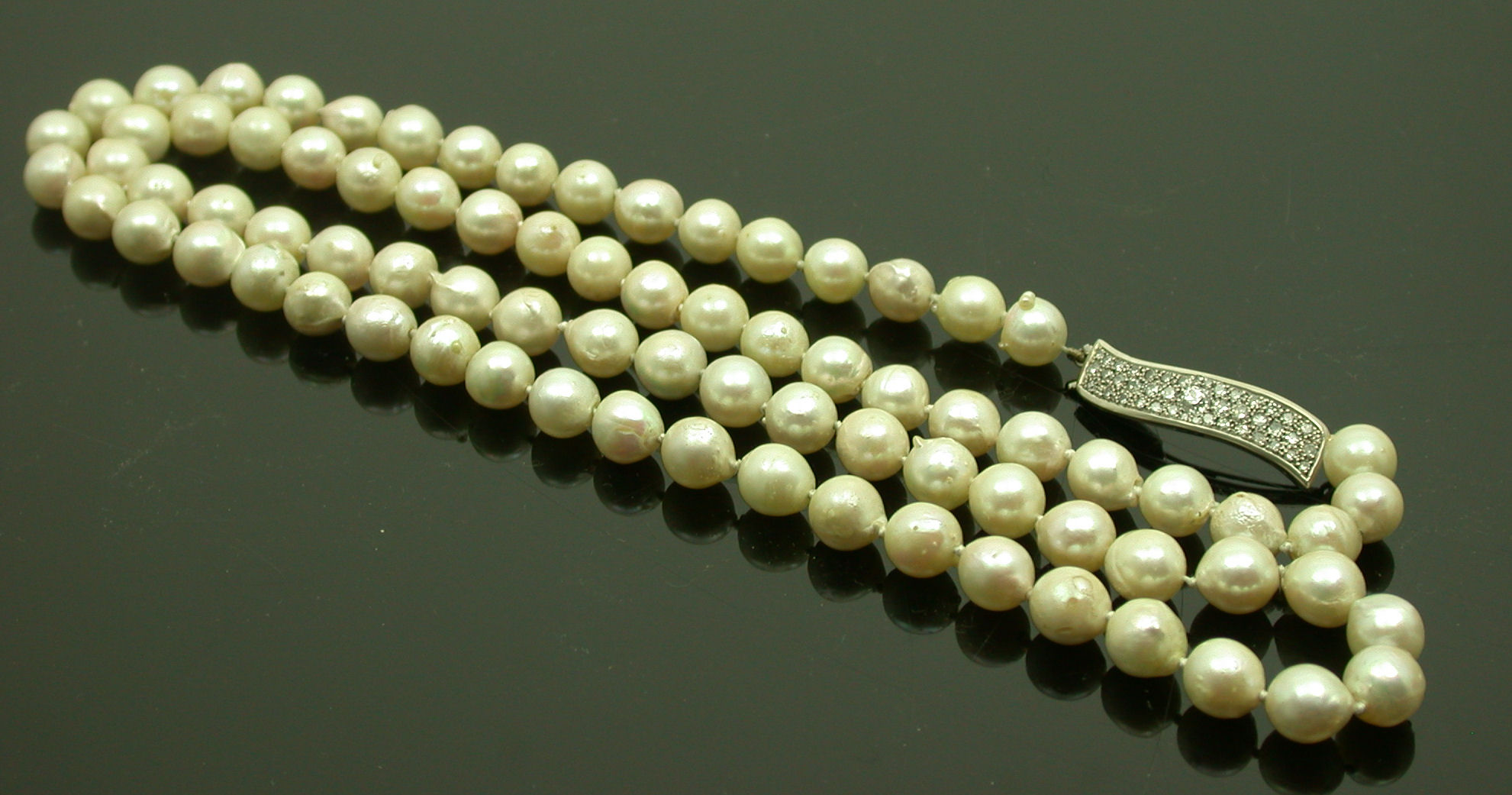 composed of off-round uniform beads of approximately 8mm diameter, with 9ct white gold scroll form clasp pave set with graduated old European and single cut diamonds