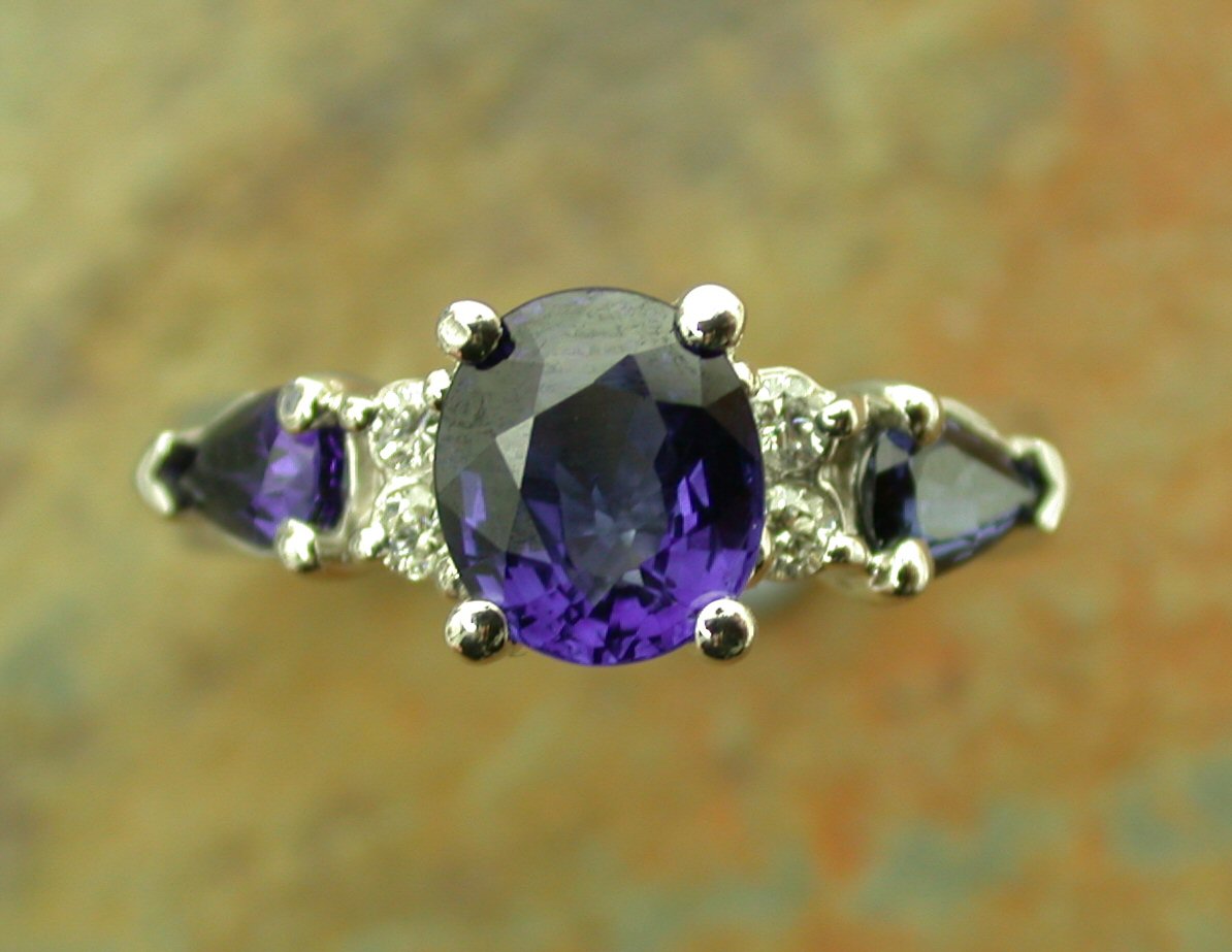 the central claw set oval cut sapphire flanked to either side by a pair of brilliant cut diamonds and a pear cut sapphire