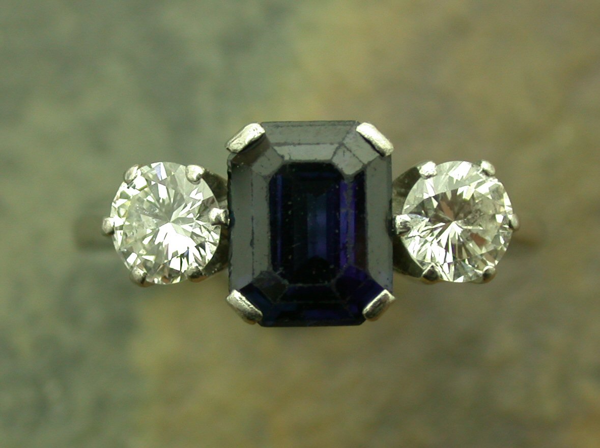 the central corner claw set trap cut sapphire flanked to either side by a round brilliant cut diamond