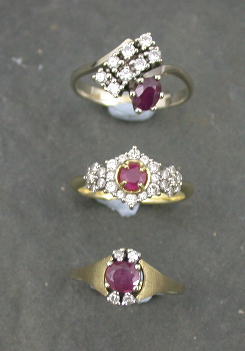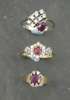 with central claw set circular cut ruby, within a hexagonal surround claw set with brilliant cut diamonds and flanked to either side by a similarly set floral cluster, together with two other ruby and diamond cluster rings (3)