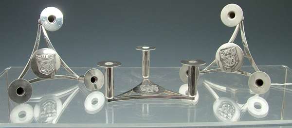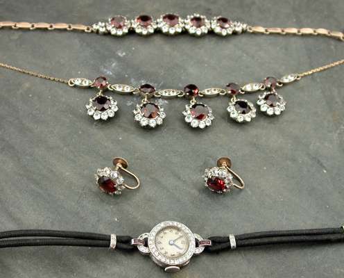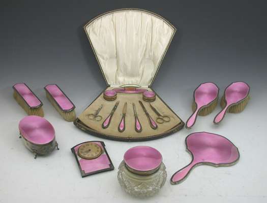 A gilt, bright pink and black guilloche enamelled dressing table suite,