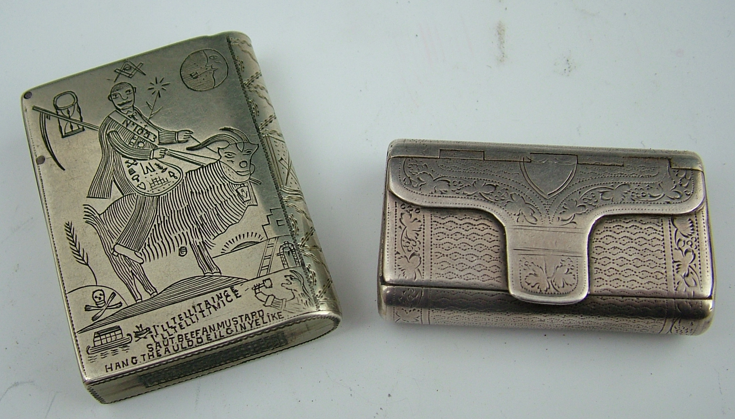 with marks for Birmingham 1817, maker John Shaw, modelled in the form of an engraved purse, 5.1cm wide, of Masonic interest - a vesta case with various masonic emblems and figures, inscribed Dr Richardson Monifeith (2)