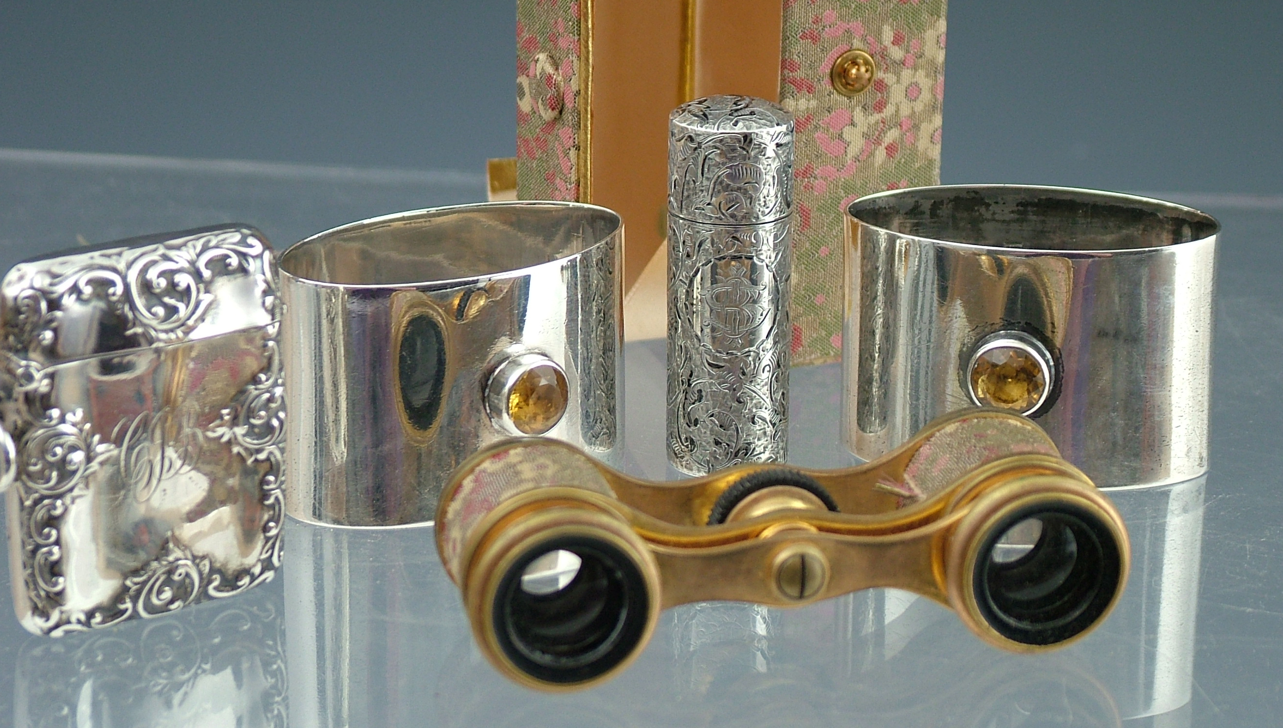 with marks for Chester 1890, of cylindrical form, with all-over engraved decoration, a pair of plain napkin rings set with cairngorms, a vesta case and a cased pair of opera glasses (5)