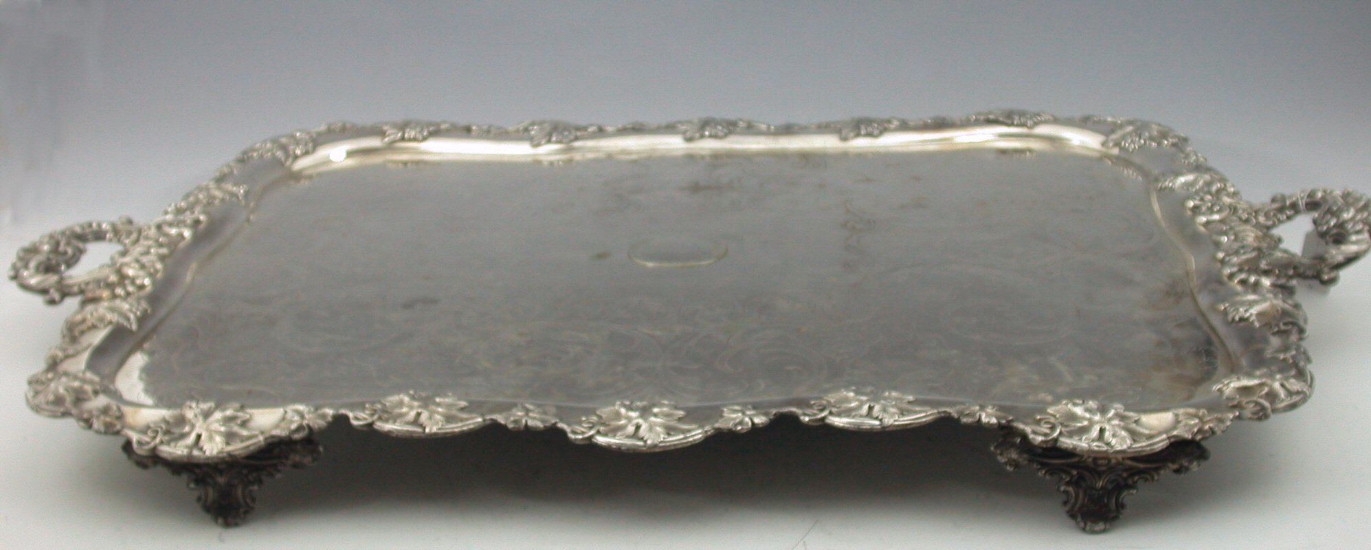 with cast vine leaf border, engraved with foliate and C-scroll decoration, all on foliate feet