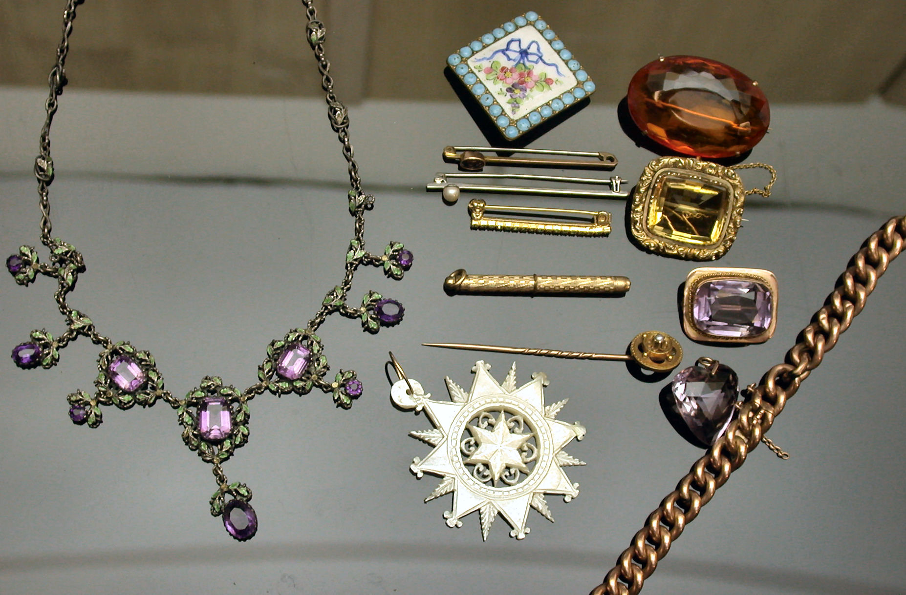 to include a faceted heart cut amethyst pendant, a 9ct gold mounted cushion cut amethyst brooch, a rectangular cut citrine brooch with scroll carved surround, an amethyst and green enamelled necklace, a bouton pearl set ring, a seed pearl set stick pin, three gem set bar brooches, a curb link bracelet and other pieces (qty)