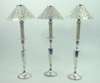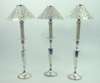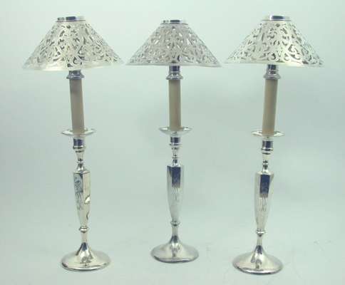 the circular bases with tapered panelled columns and vase shaped capitals with detachable mounted ivorine sticks and scroll pierced shades, columns initialled, with inscription to base of one