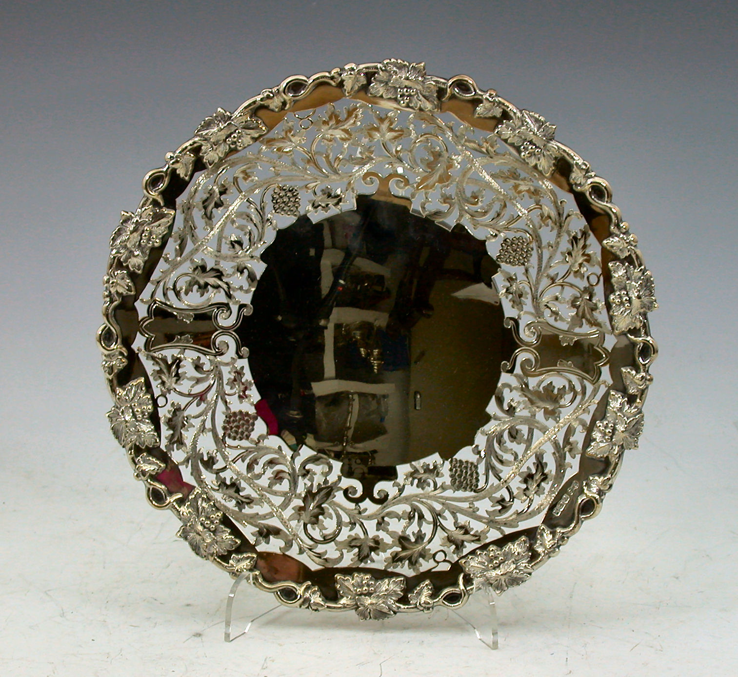 with marks for Sheffield 1927, maker E&S, of shaped circular form, with fruiting vine cast edge and similarly decorated pierced and engraved border, on plain circular foot, inscribed to base Edward & Sons, Glasgow