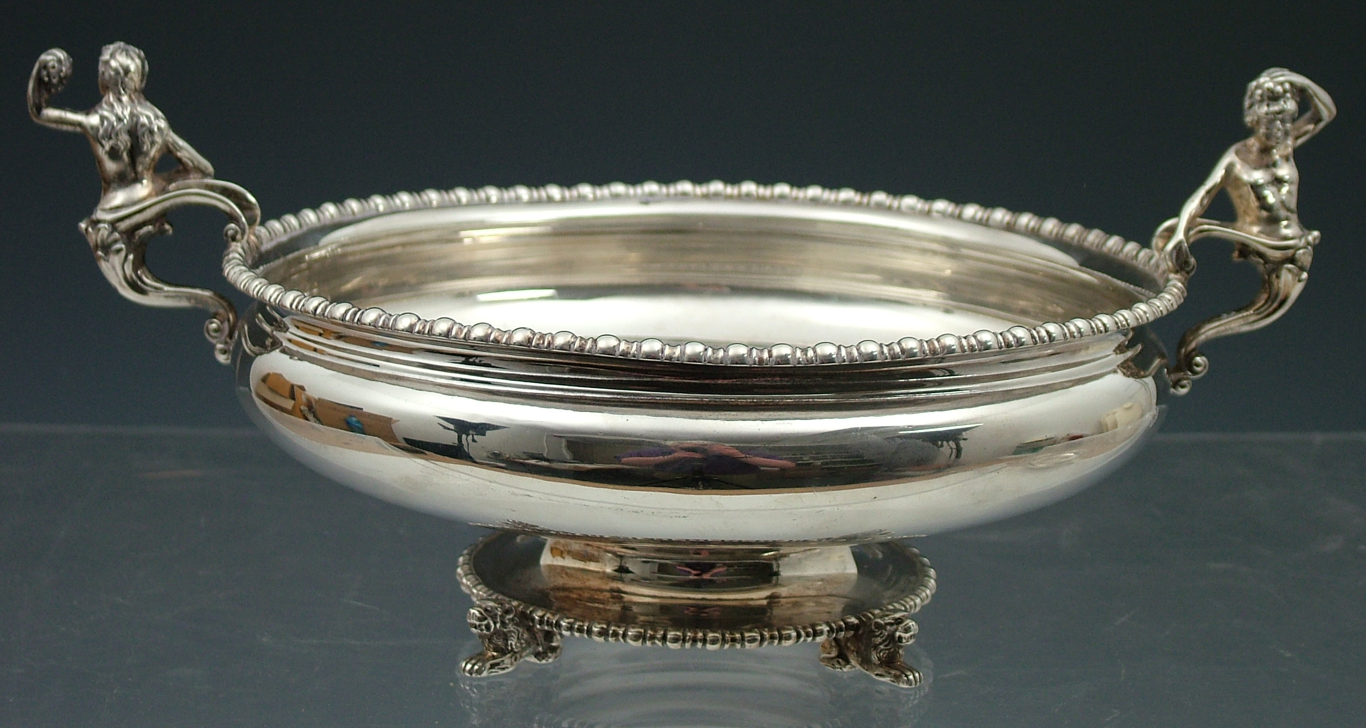with marks for London 1909, retailed by Brook & Sons, of squat circular form, with beaded border, handles in the form of Bacchus and a mermaid, all on a circular base, with Canova lions as feet