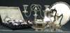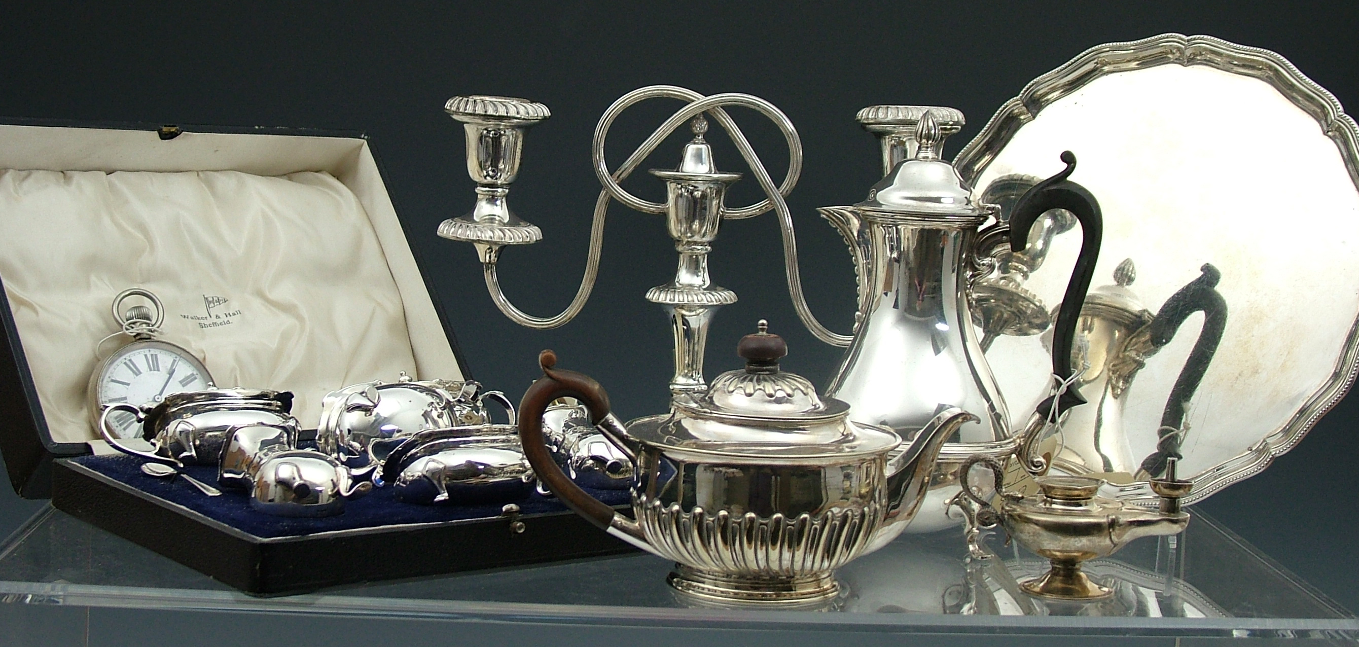 to include a shaped circular salver, with marks for London 1932, by Asprey & Co. Ltd, of plain form with beaded border, 24cm diameter, a Scottish Georgian sugar sifter spoon, Edinburgh 1786, by PR, a cased six-piece condiment set, London 1933, by Walker & Hall, a baluster form hot water pot, London 1904, assorted caddy spoons, a drum inkwell and other pieces, various dates and makers, together with a few electroplated items, to include a pair of candelabra, a travelling watch (qty)
