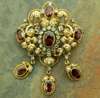 the central collet set oval cut garnet within a border of rose cut diamonds to a pierced scrolling surround set with seed pearls, rose cut diamonds, rubies and three oval cut garnets, suspending another three oval cut garnet drops