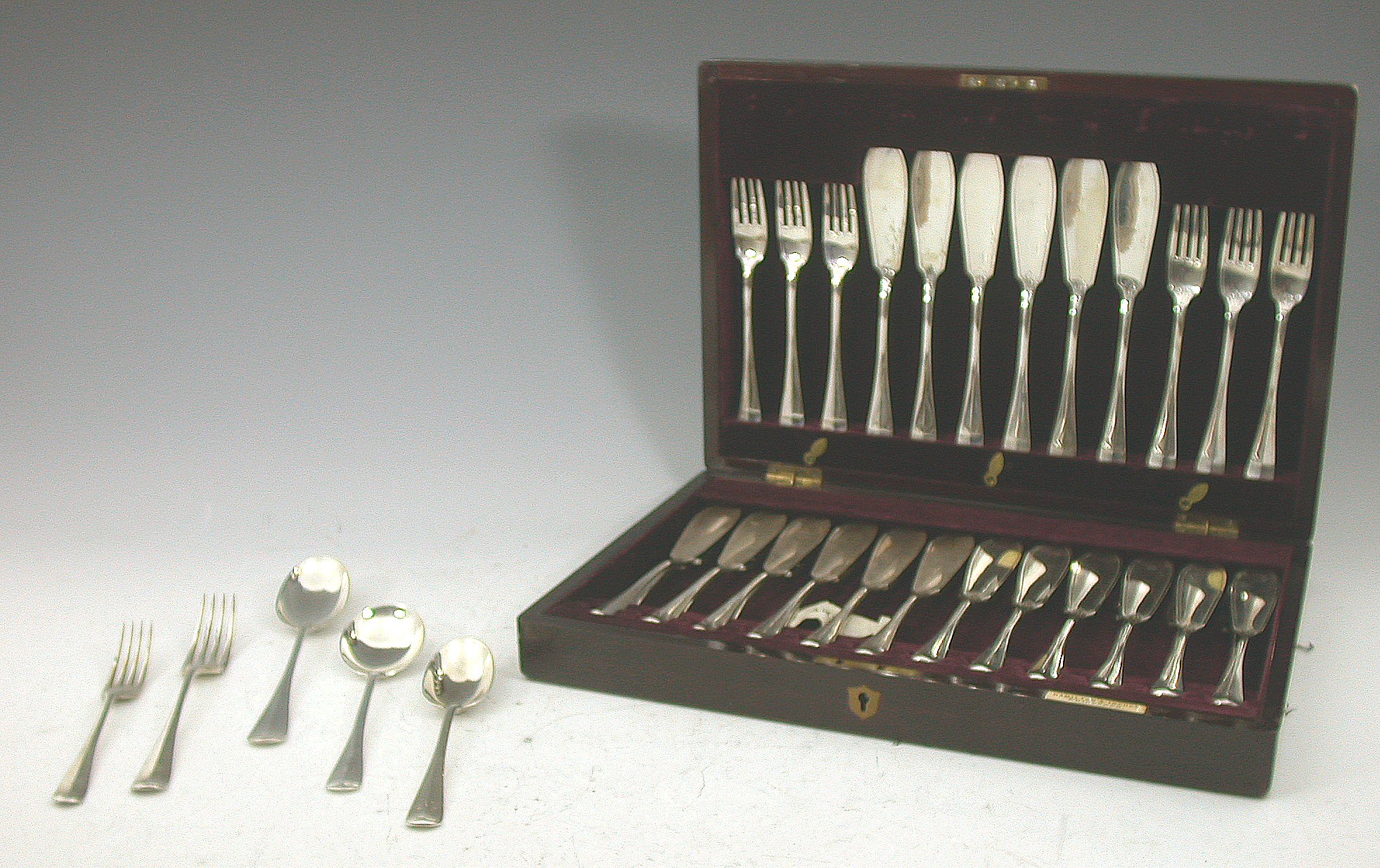 with marks for London 1964, at least thirty-one pieces, a mahogany cased set of eighteen fish knives and forks, Edinburgh 1909, by Hamilton & Inches, together with assorted silver and electroplated flatware and cutlery (qty)