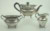 with marks for Glasgow 1898, maker Jas. Forrest, comprising teapot twin handled sugar and milk jug, each of oval form with foliate cast everted rim, on four leaf capped scroll feet, initialled