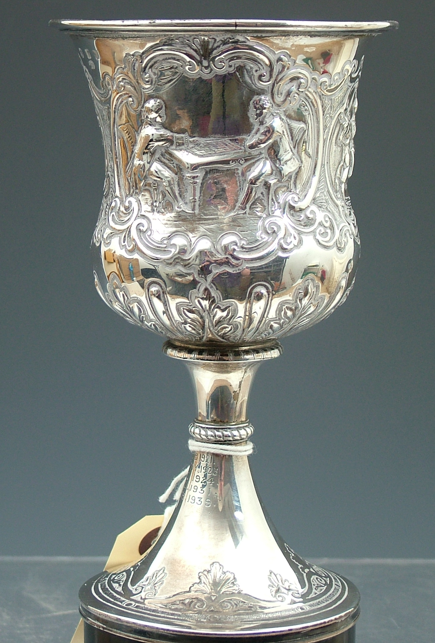 with marks for Glasgow 1893, of chalice form, C-scroll panels engraved "Fifeshire Draughts Association........Lundin and Montrave 1893" Panels of Winners and a panel of two gentlemen, playing draughts