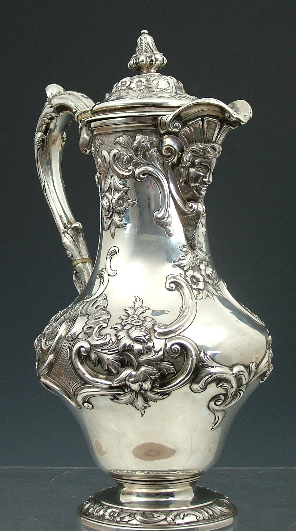 with marks for Edinburgh 1844, maker D.C. Rait & Son of Glasgow, of tall baluster form, the lid with a leaf clasped finial, the spout with well modelled mask detail, the body with all over c-scrolls and floral sprays and panels of fish scales, circular spreading foot