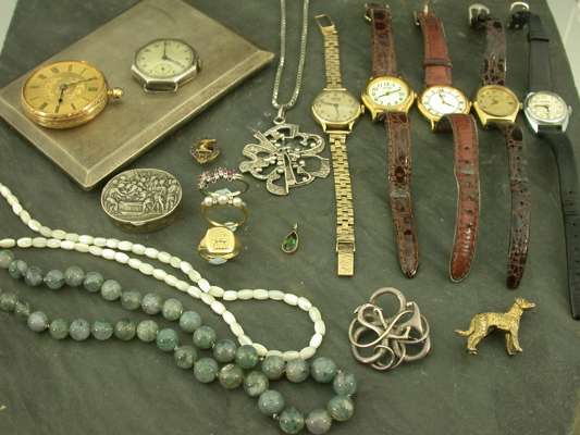 to include a pearl and diamond ring, an 18ct gold signet ring, a moss agate bead necklace, a Scottish silver brooch and pendant, an 18ct gold open faced pocket watch, assorted wristwatches, a silver cigar cutter, cigarette case, vesta case and other pieces (qty)