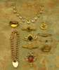 a 9ct rose gold curb link bracelet with padlock clasp, a cased 15ct gold mounted citrine set bar brooch, another citrine set brooch, a citrine set fob, a paste and seed pearl set pendant, another pearl set pendant and four assorted brooches (qty)