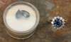 the central claw set circular cut blue topaz within a surround of round brilliant cut diamonds, together with a pair of blue topaz pear cut stones (unmounted)