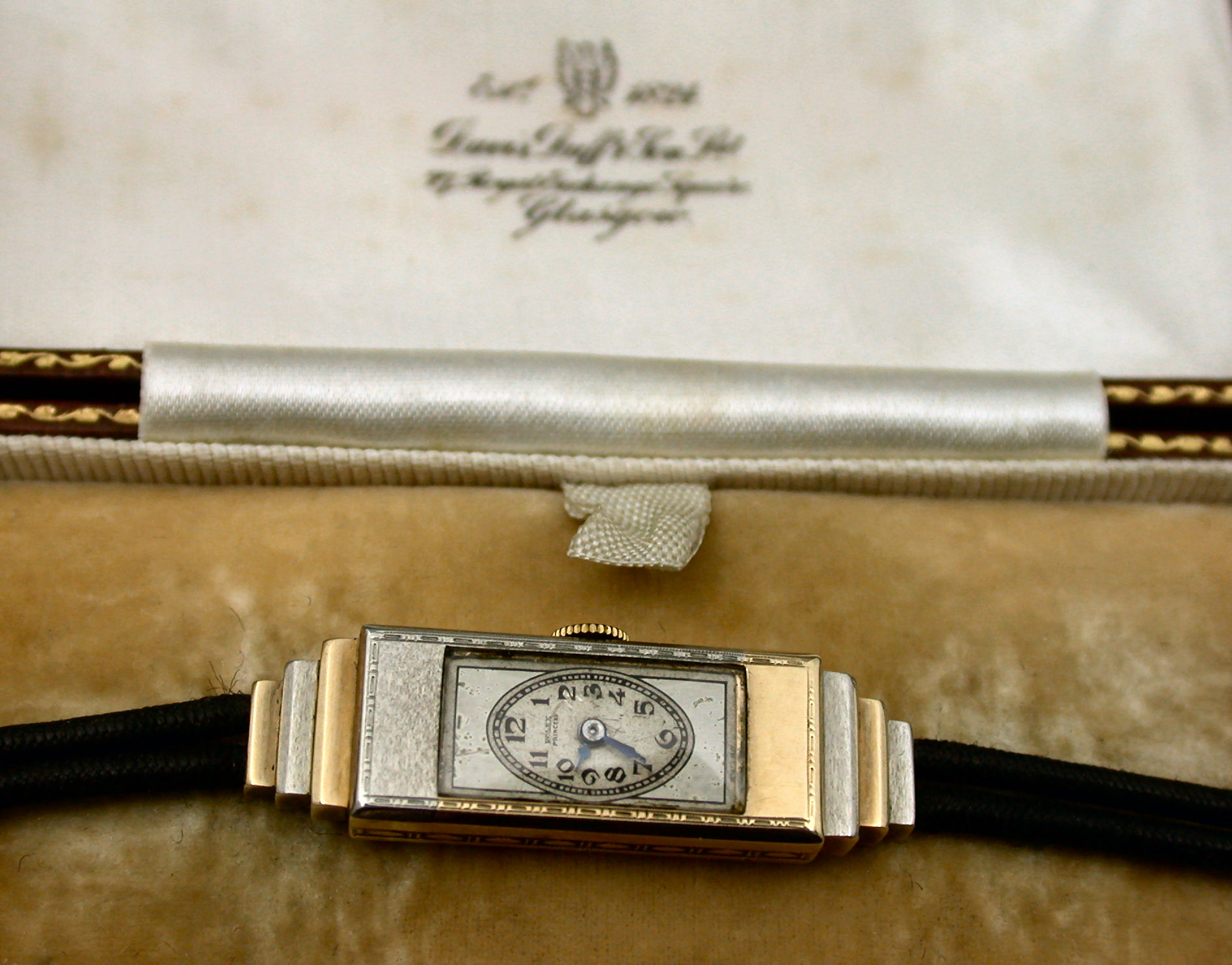 the slim rectangular case with oval dial with black arabic numerals and hands, flanked by stepped shoulders, fitted to a 9ct gold mounted black cord strap, contained in a fitted case
